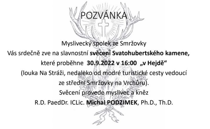 Myslivecký spolek ze Smržovky vás srdečně zve na slavnostní svěcení Svatohubertského kamene, které proběhne 30. 9. 2022 v 16:00 “v Hejdě” (louka Na Stráži, nedaleko od modré turistické cesty vedoucí ze středni Smržovky na Vrchůru).